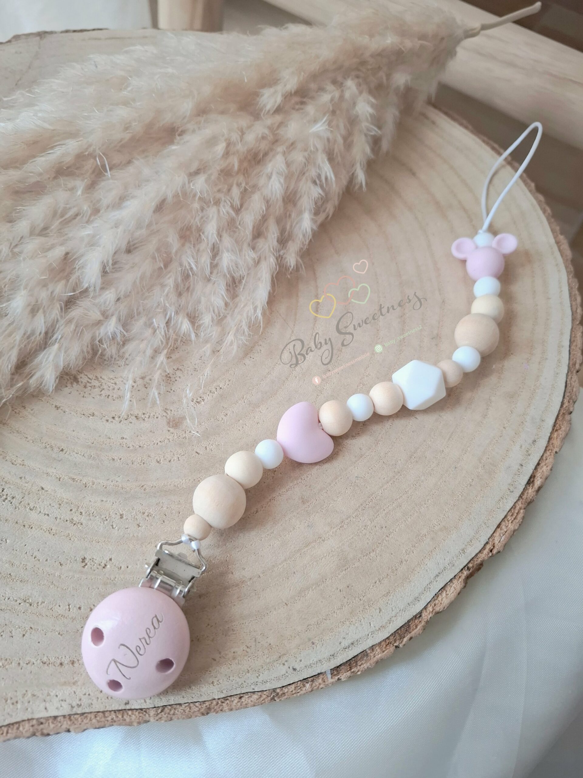Légère et résistante, cette attache tétine gravée personnalisée est fabriquée de perles en bois et silicone de grande qualité, de différentes tailles, formes et couleurs. Fil de qualité en Polyester, ultra résistant.