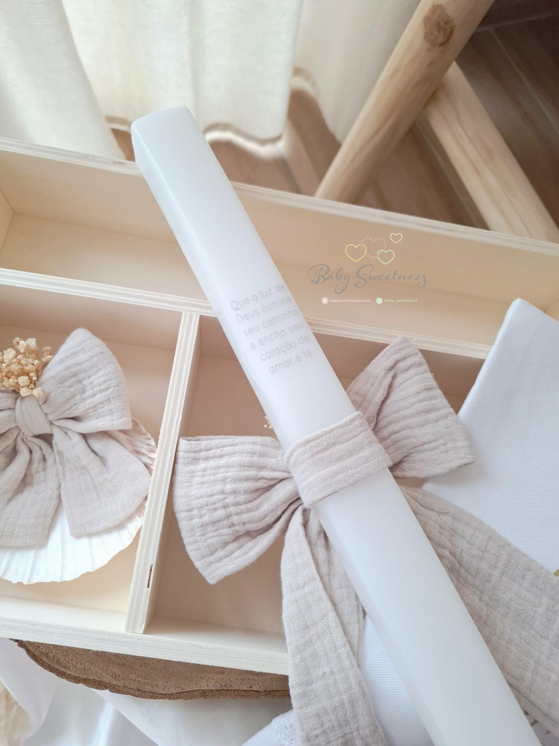 En achetant une bougie de Baptême de la marque Baby Sweetness, vous avez la possibilité de la personnaliser avec le nom de votre enfant et date du baptême. Il est également possible de choisir la couleur du ruban et fleurs séchées en déco. Veuillez préciser toutes ses informations avant de passer commande.