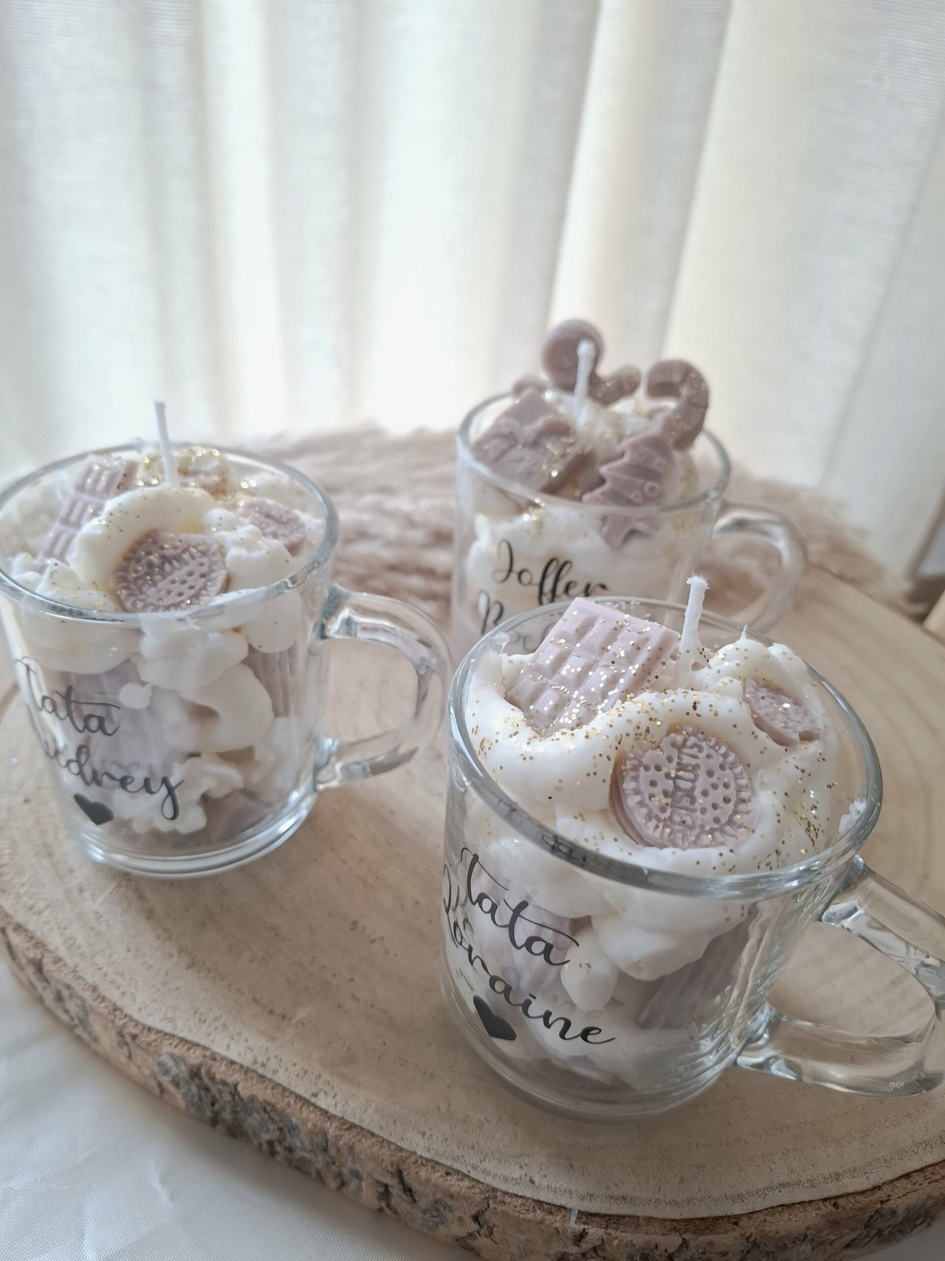 Ces bougies gourmandes cookies et chocolat, à la cire de soja naturelle, permettent d’avoir un réel plaisir olfactif et visuel. Conditionnées dans des pots en verre, le Parrain et le Marraine auront l’impression de tenir entre leurs mains, un dessert sucré et gourmand. Les plus gourmands de sucrerie auront qu’une envie : dévorer cette bougie !