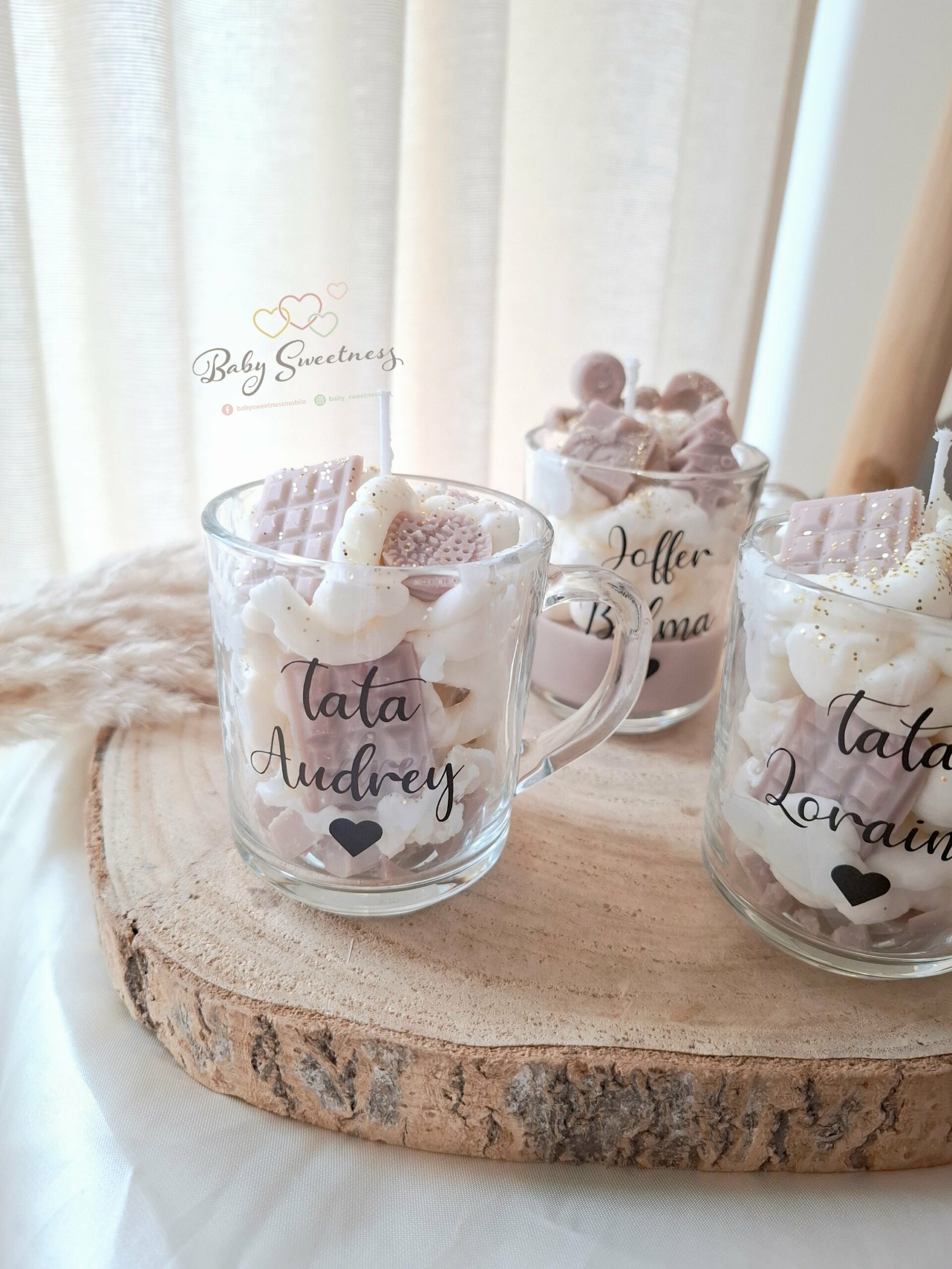 Ici, ils n’auront pas besoin de sortir une cuillère à dessert, mais seulement d’une allumette pour allumer la mèche en coton. Le réel avantage de cette bougie, est que les parrains ne prennent pas de poids, le plaisir sera simplement visuel et olfactif.