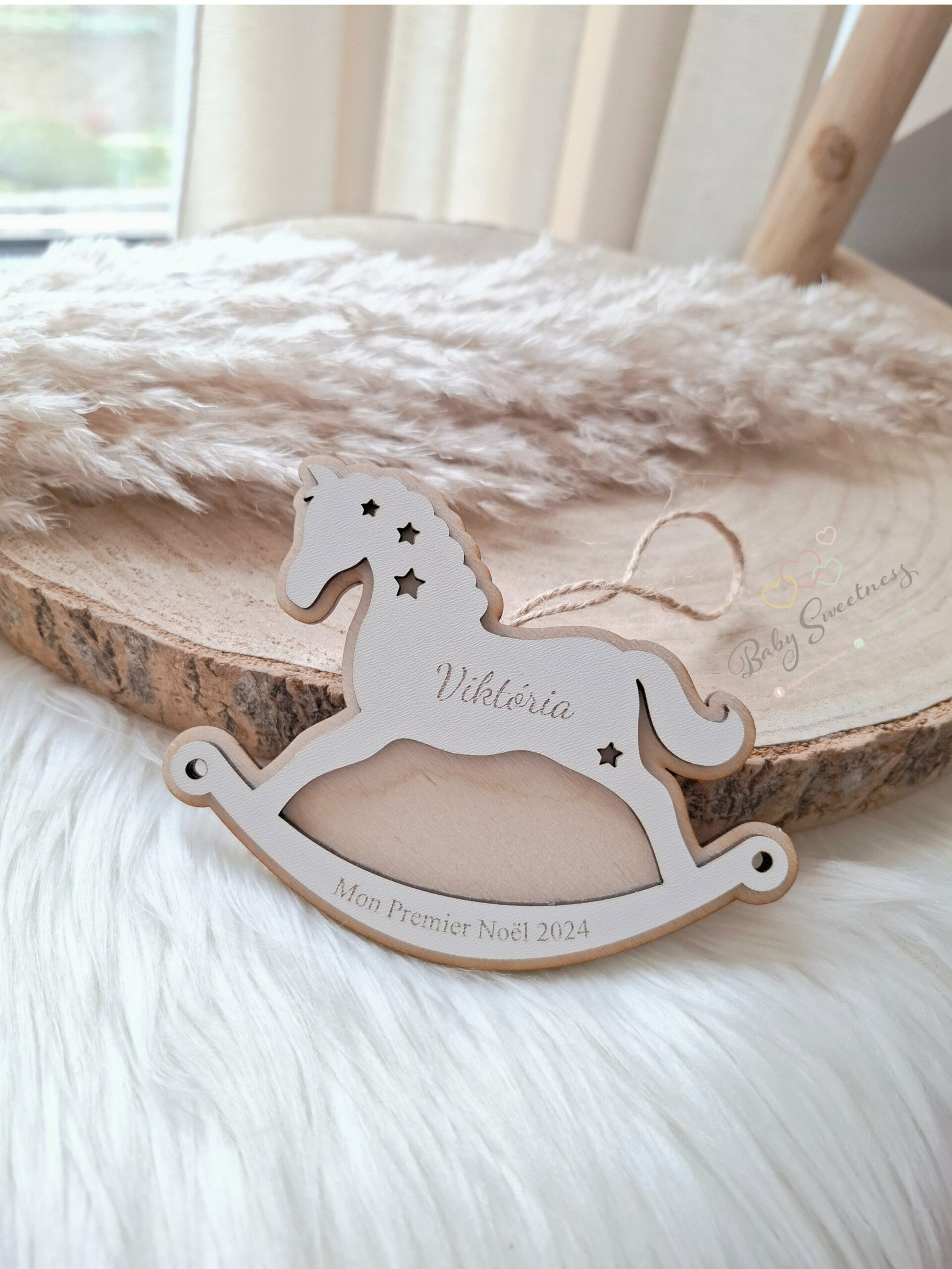 Fabriquées en bois, les boules de Noël cheval à bascule donneront une touche très élégante à votre sapin, vos cadeaux ou encore votre table de Noël. Écrivez les prénoms des membres de votre famille ainsi que la phrase souhaitée et offrez ces magnifiques boules de Noël personnalisées à vos proches.