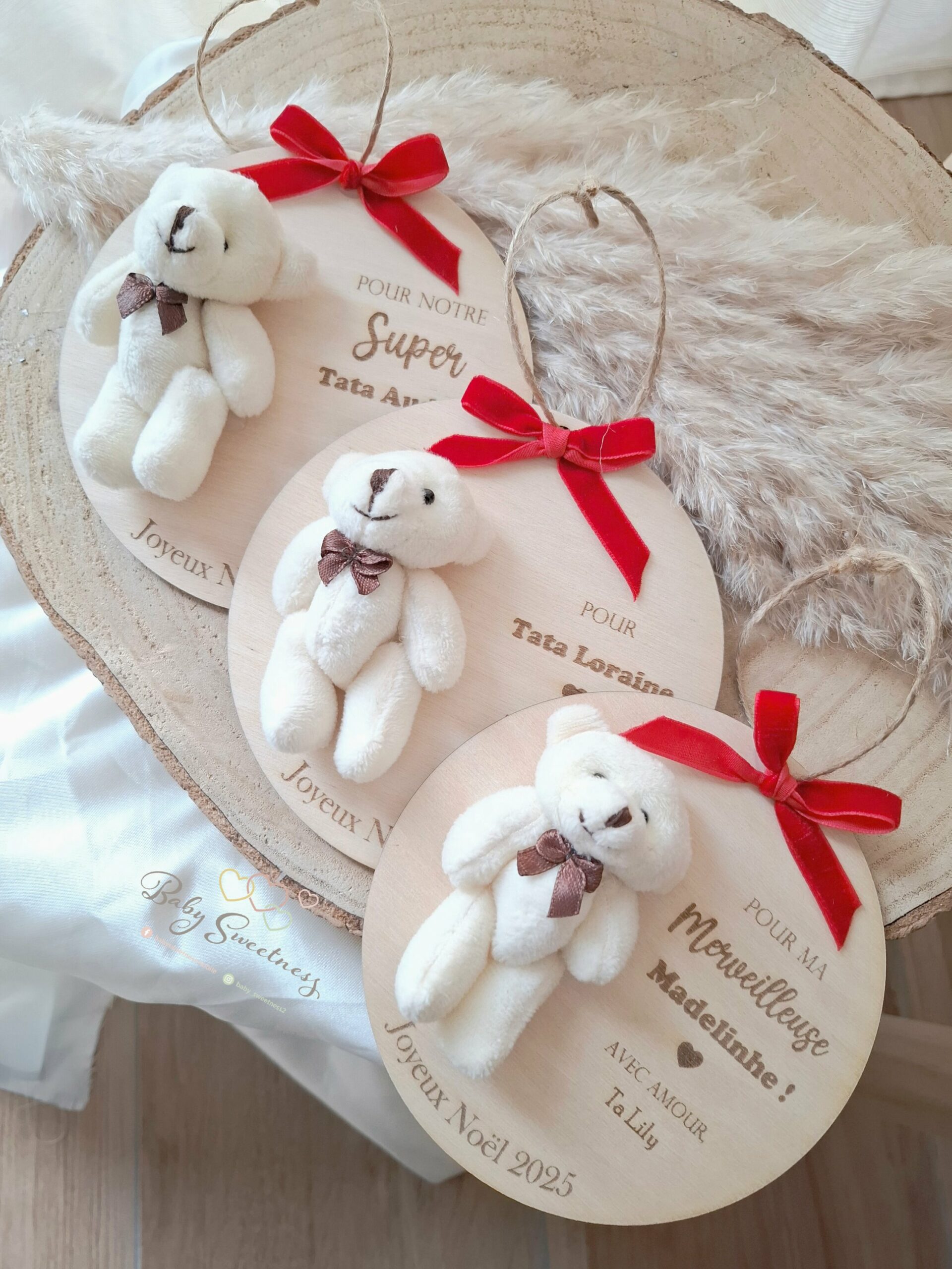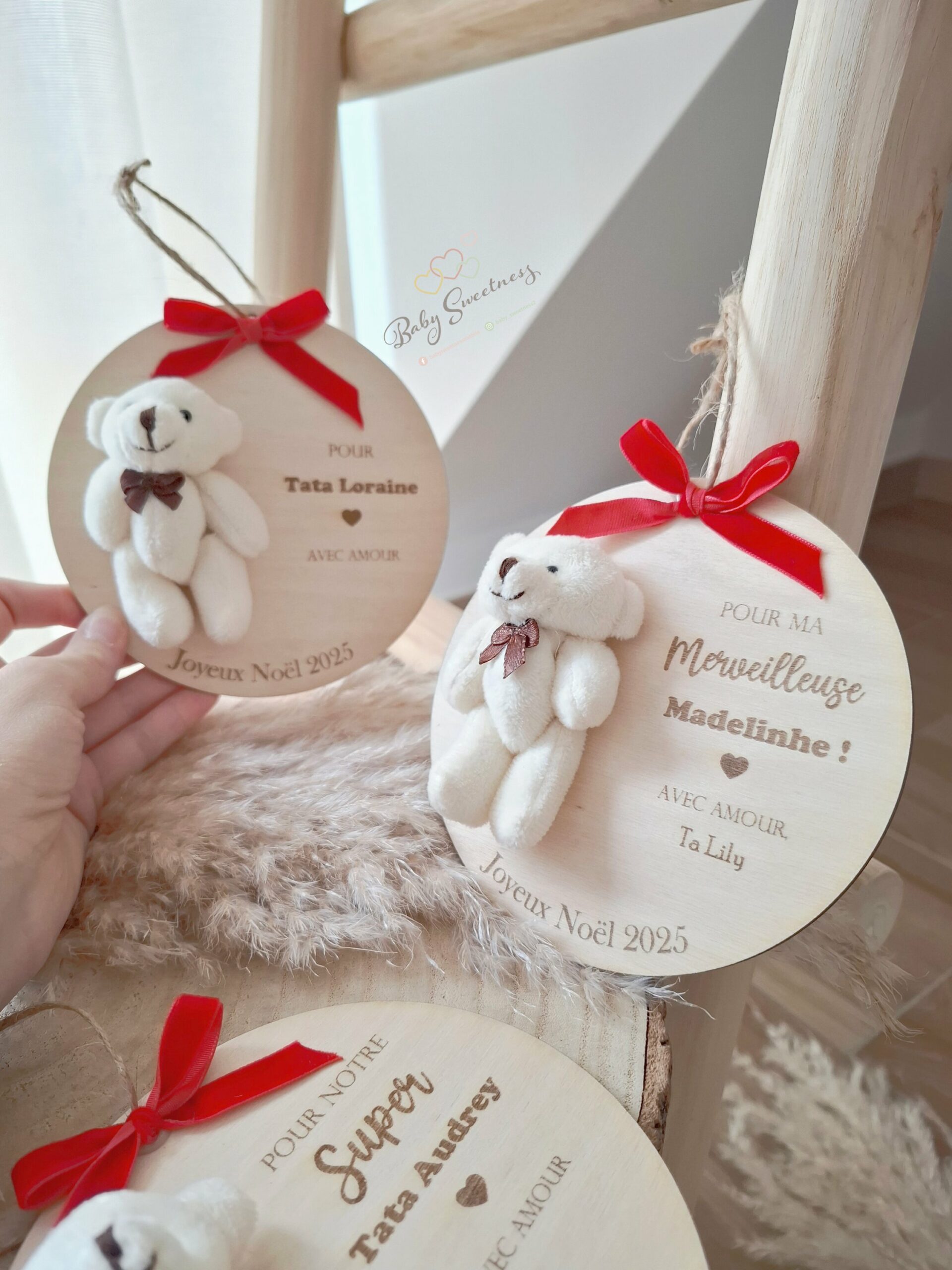 Les boules de Noël ourson en peluche avec prénom donneront une touche très élégante à votre sapin, vos cadeaux ou encore votre table de Noël. Écrivez un joli message et offrez ces magnifiques décorations personnalisées à vos proches.