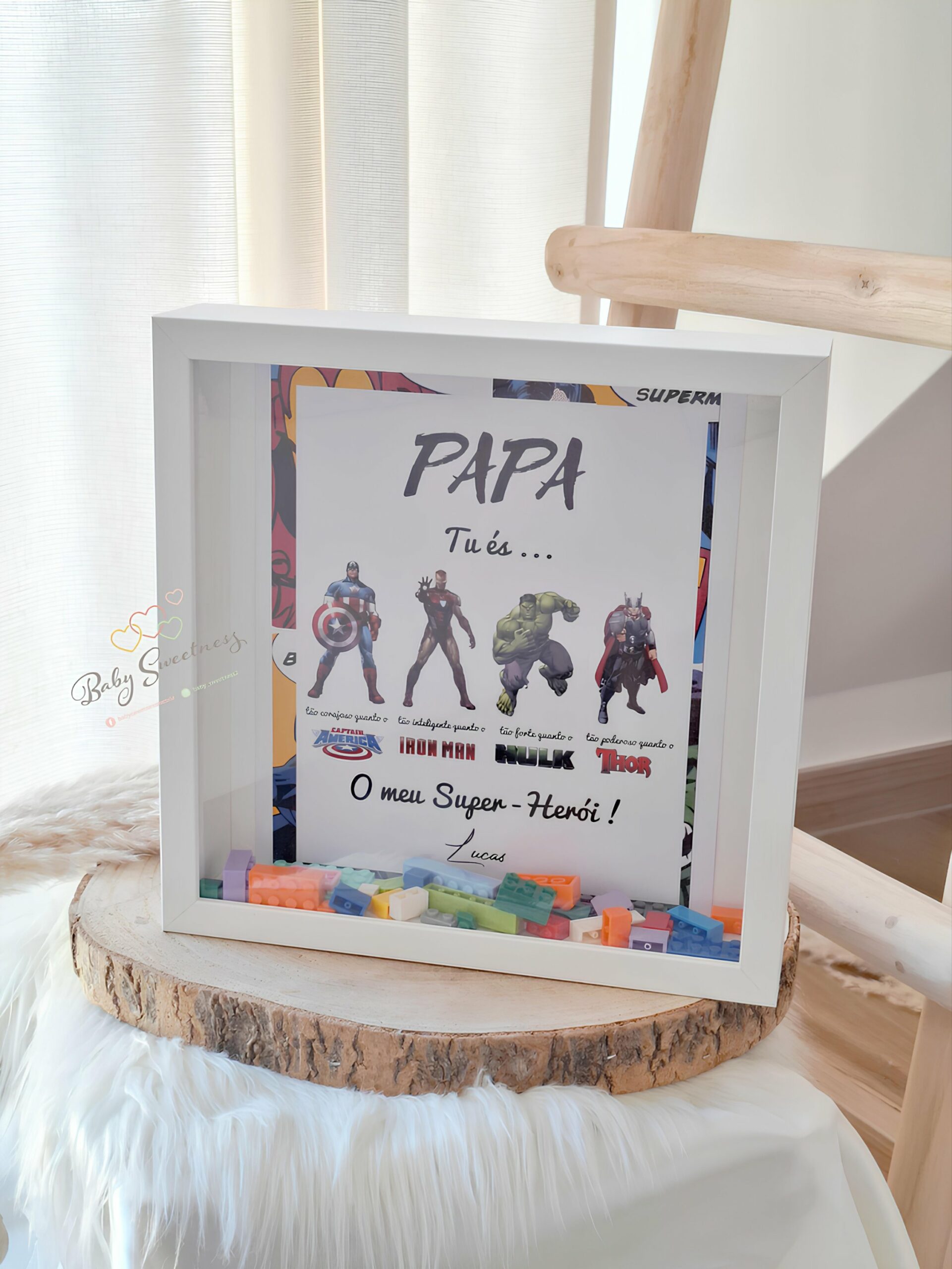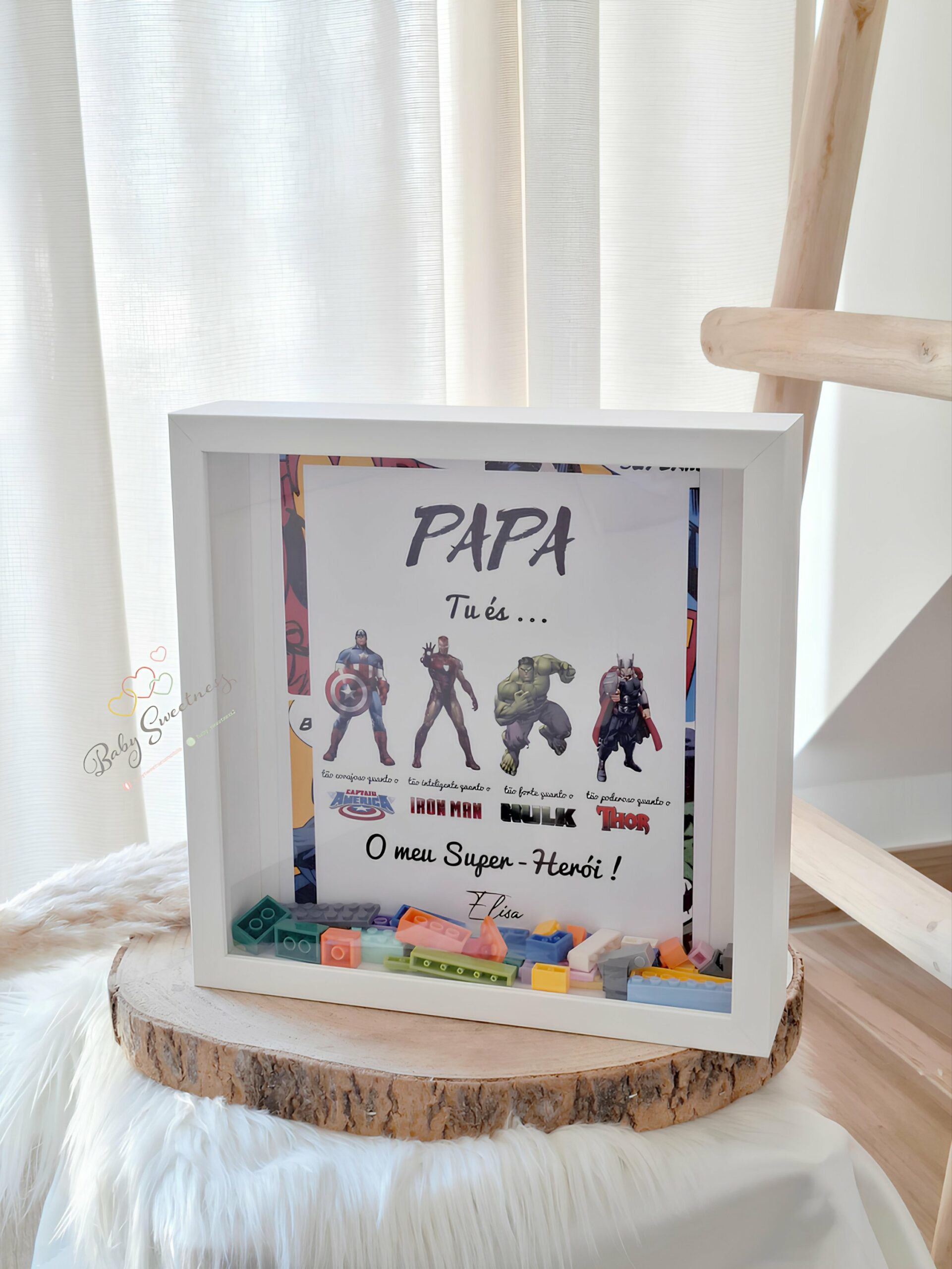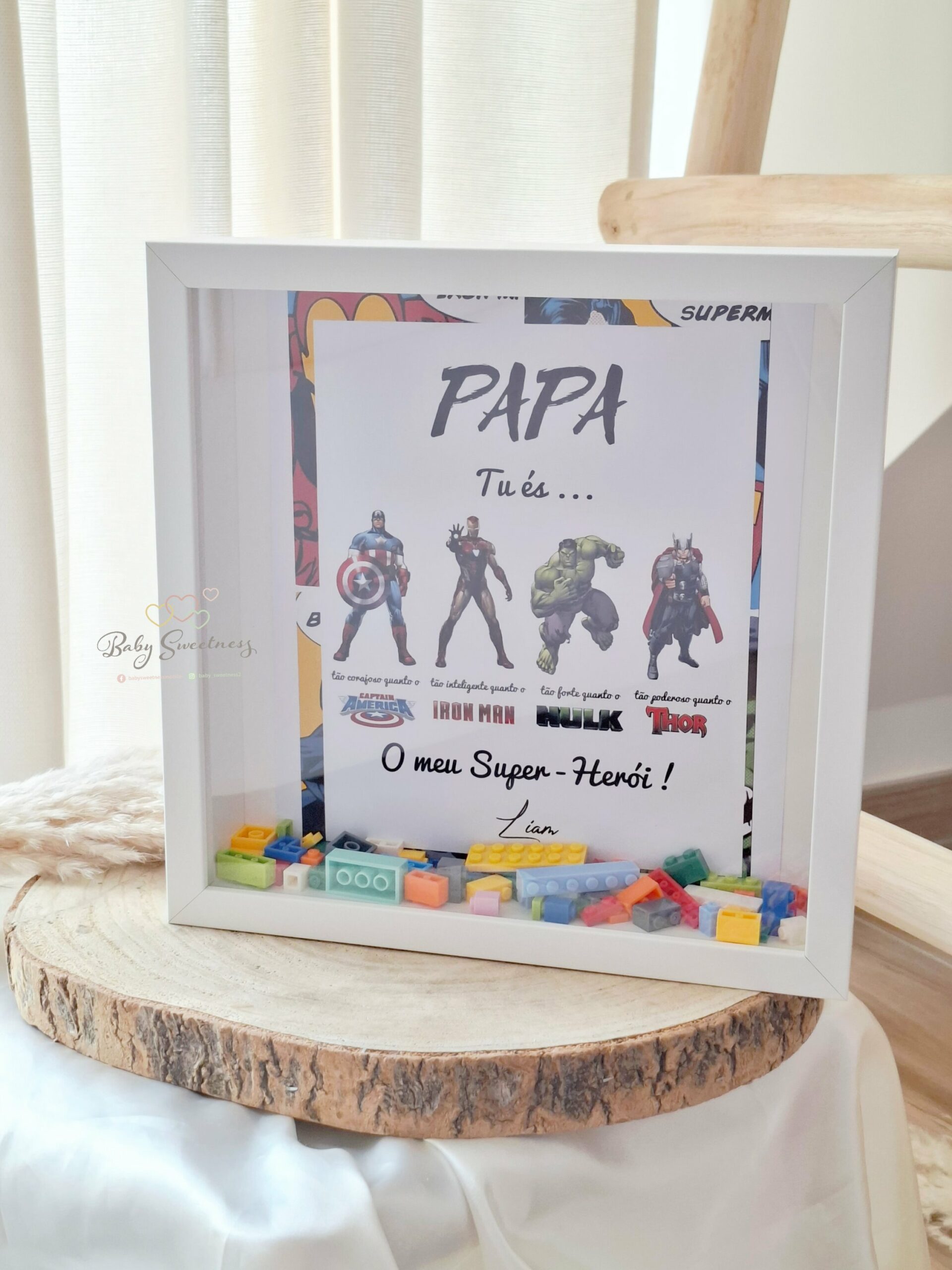 En achetant un cadre «Papa, mon Super Héros » de la marque Baby Sweetness, vous avez la possibilité de le personnaliser avec le nom de vos enfants. Le fond du cadre est décoré par des legos de différentes couleurs. Le cadre peut être réalisé dans n’importe quelle langue. Pour cela, veuillez indiquer le texte souhaité avant de passer commande.