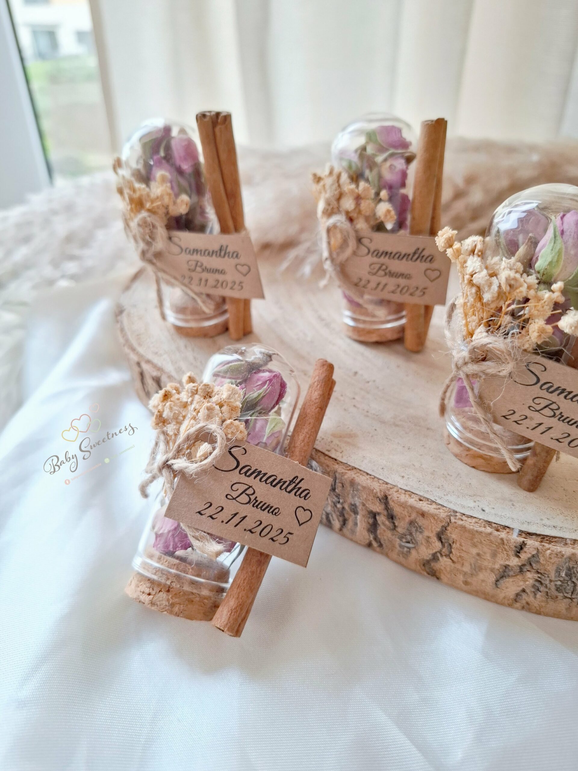 Chez Baby Sweetness, c’est simple ! Je vous propose ces jolis cloches en verre avec des roses séchées et de la cannelle. Vous pouvez les personnaliser à votre goût afin de remercier vos invités de leur présence et leur prouver votre amour.
