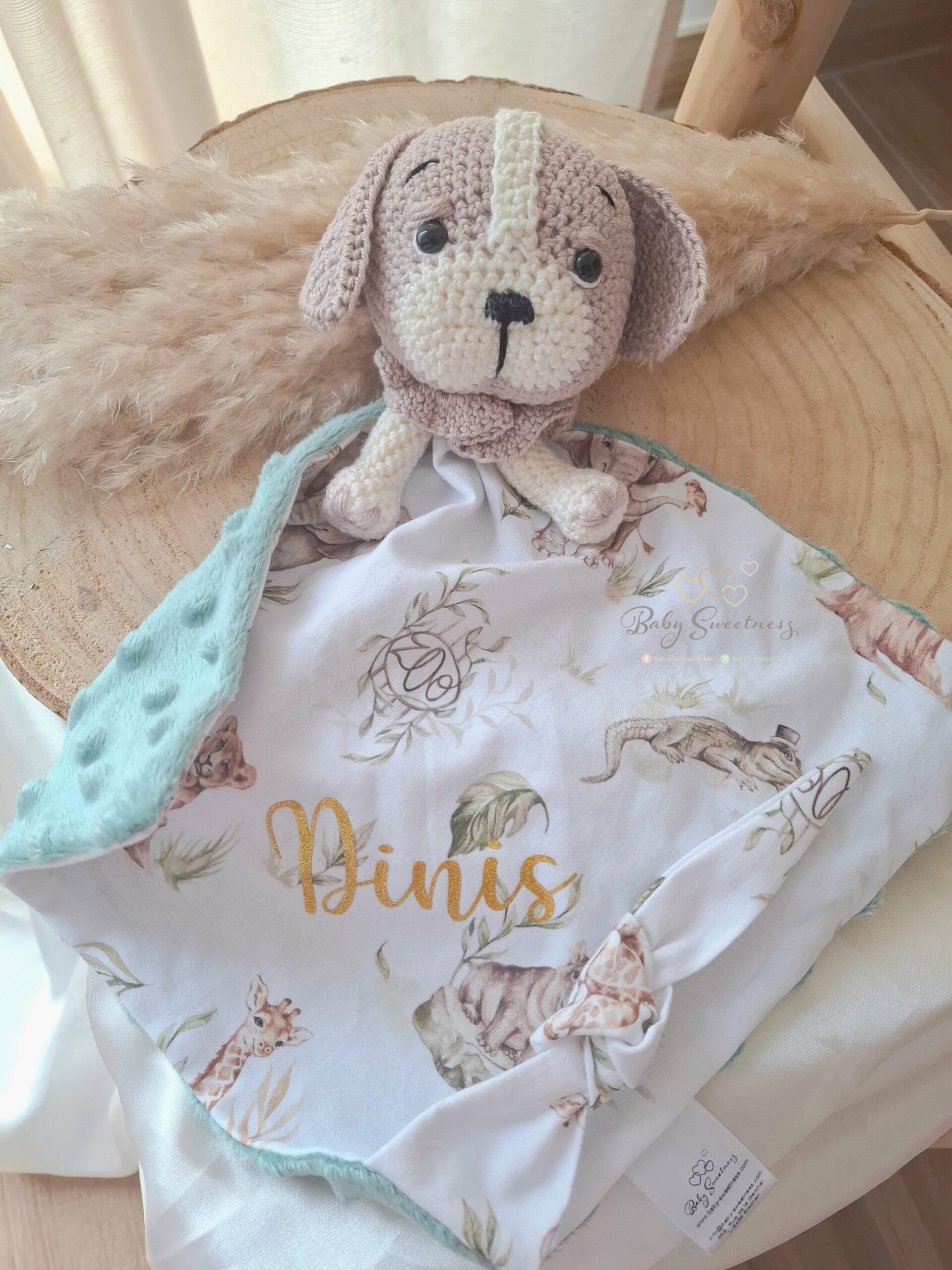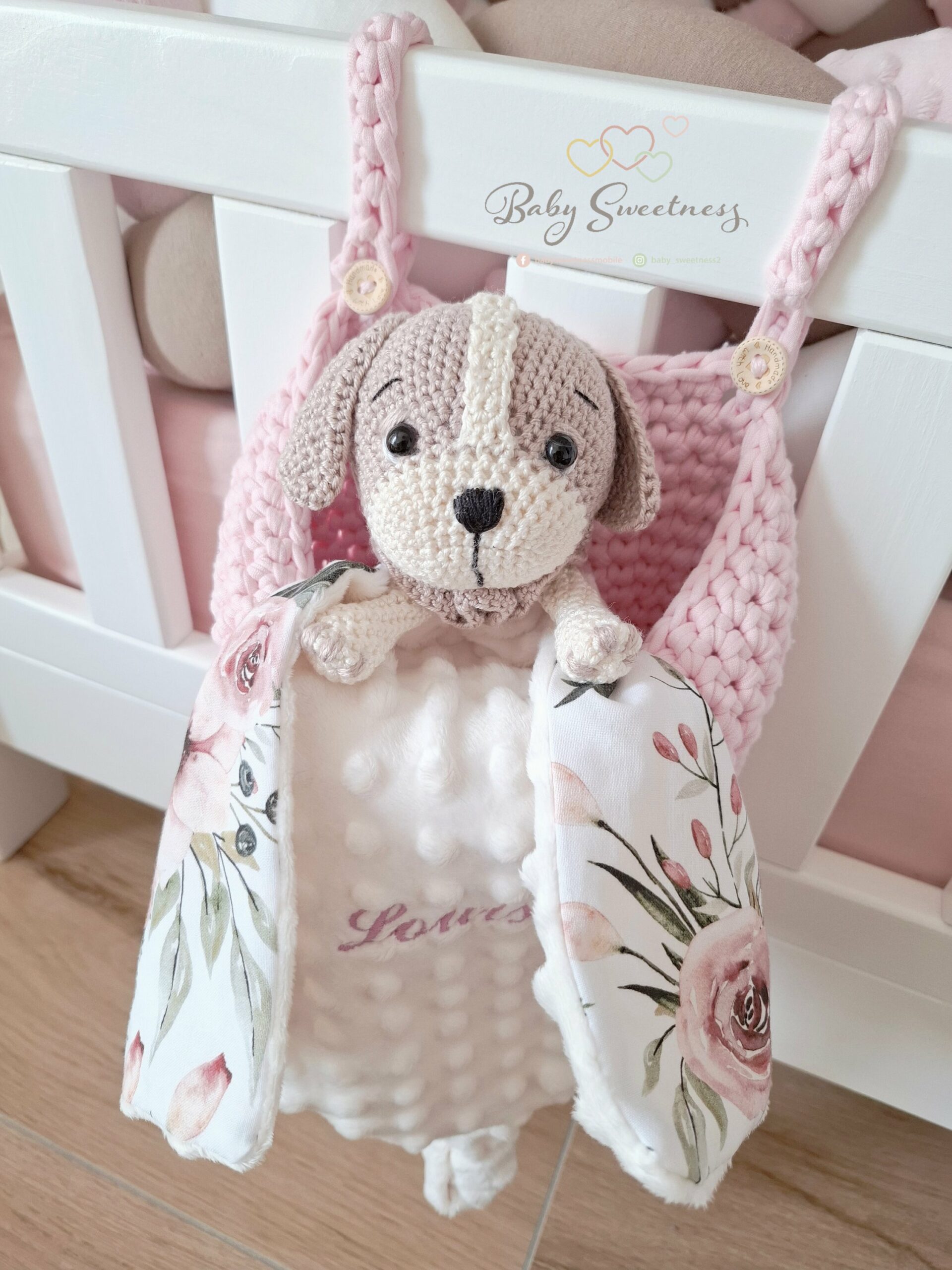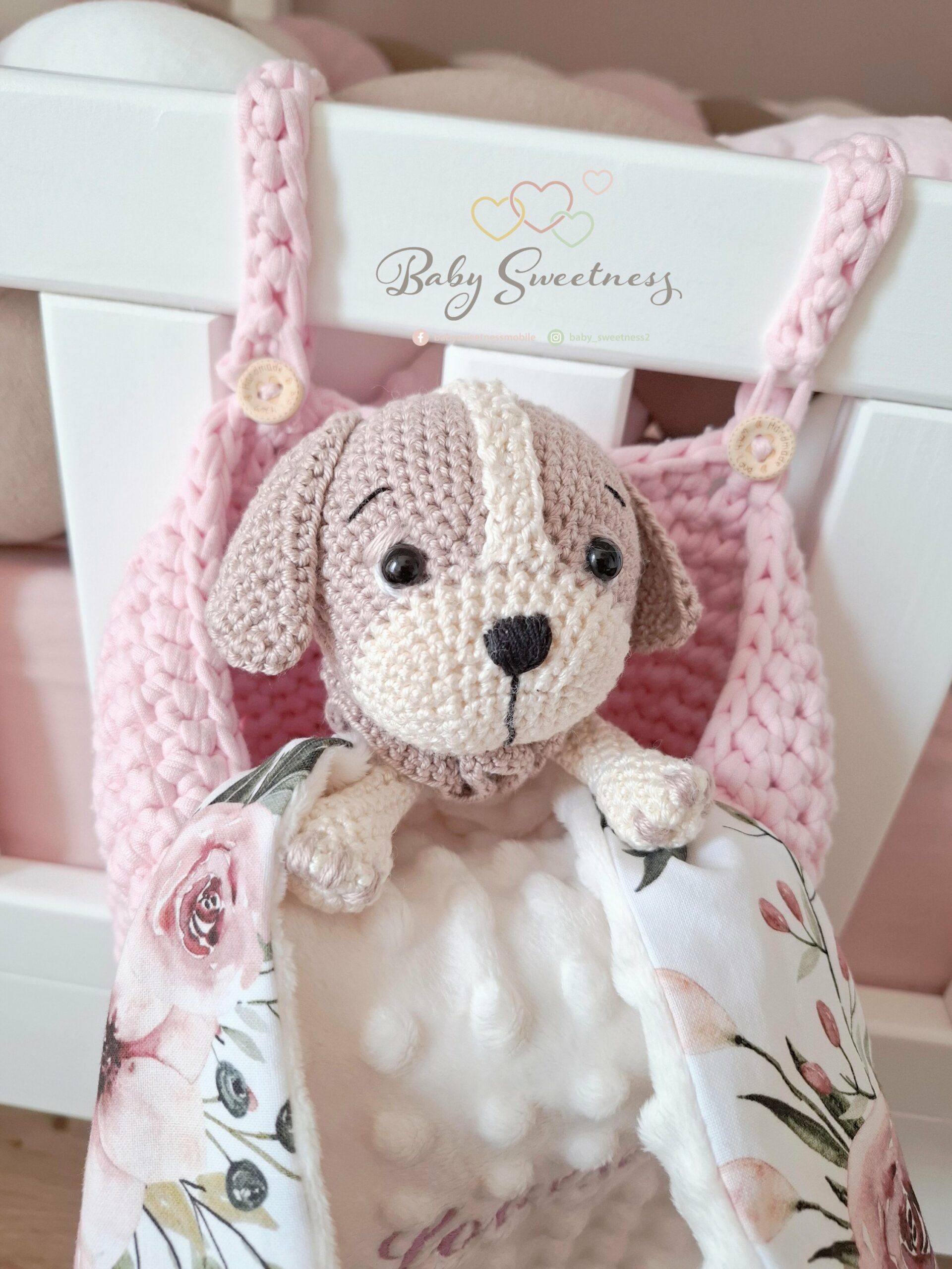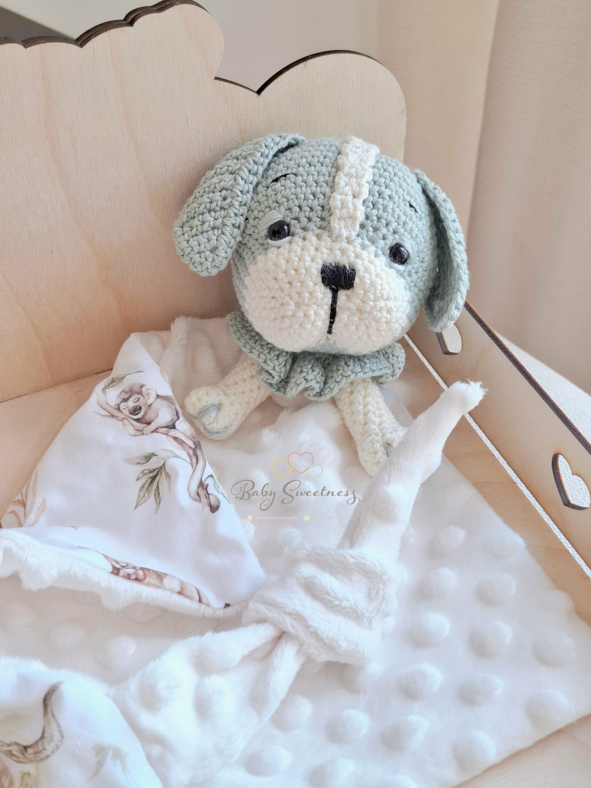 Conçu avec amour et à la main, ce joli doudou chien en crochet, fait de fil de qualité et de coton imprimé, polaire minky, il sera parfait pour accompagner les nuits de votre enfant et faire des beaux rêves. Papa et Maman, gardez le contre votre peau afin qu’il s’imprègne de votre odeur avant de le donner à votre bébé. Quand l’enfant grandit, c’est aussi un souvenir précieux à garder.