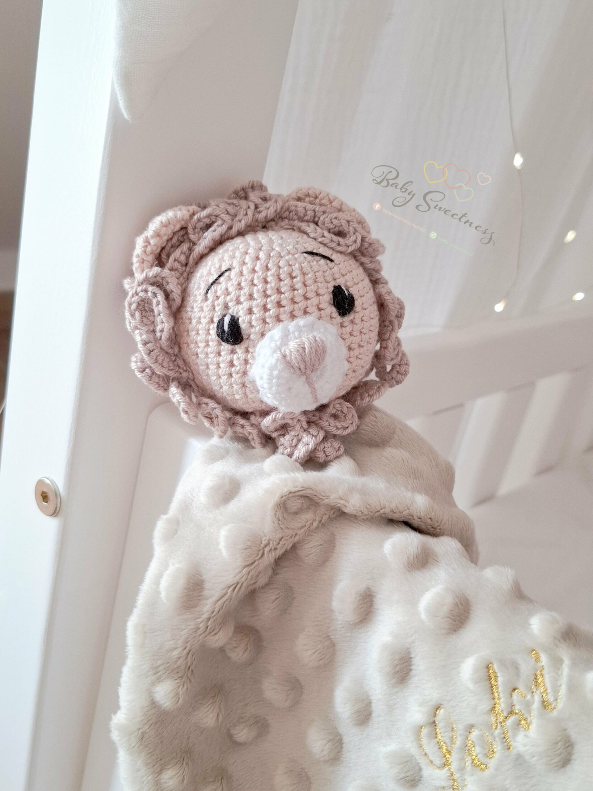 Conçu avec amour et à la main, ce joli doudou lion en crochet, fait de fil de qualité et de coton imprimé, polaire minky, il sera parfait pour accompagner les nuits de votre enfant et faire des beaux rêves. Papa et Maman, gardez le contre votre peau afin qu’il s’imprègne de votre odeur avant de le donner à votre bébé. Quand l’enfant grandit, c’est aussi un souvenir précieux à garder.