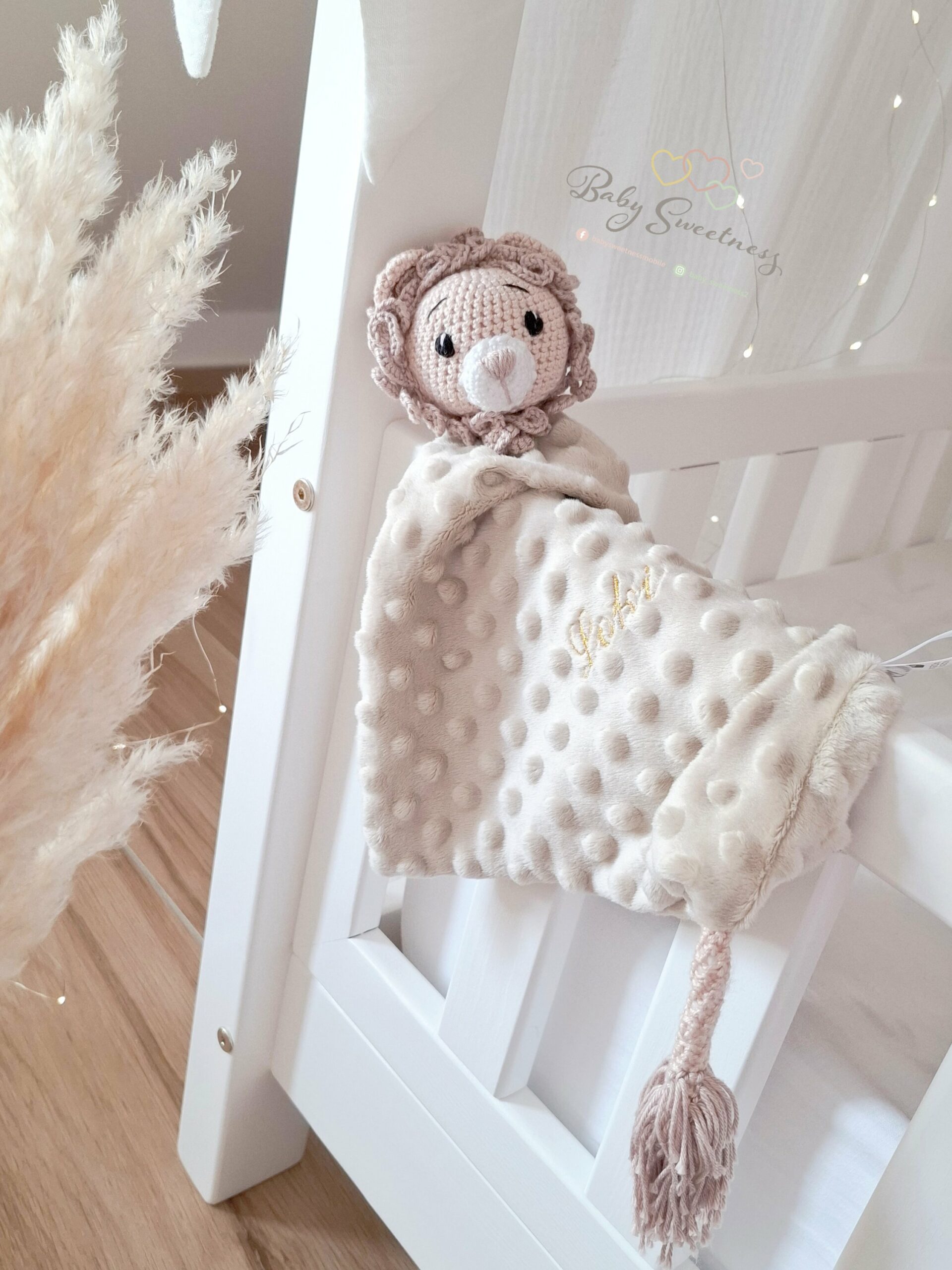 En achetant un doudou lion en crochet de la marque Baby Sweetness, vous avez la possibilité de choisir vos tissus préférés et de le personnaliser avec le prénom de votre enfant.