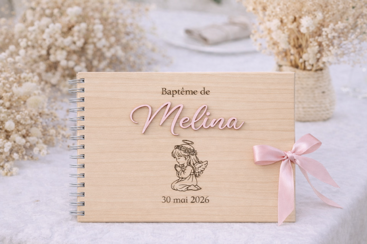 Le livre d’or en bois personnalisé comprend 40 pages blanches de haute qualité qui vous permettront de coller des photos et d’inscrire un petit message à côté. Un joli ruban de couleur de votre choix vient attacher votre livre d’or en bois.