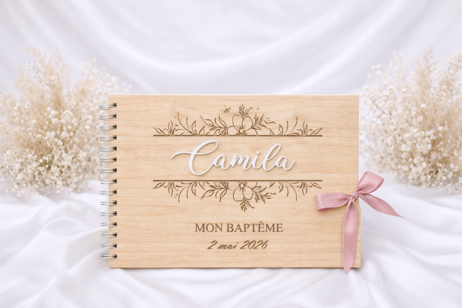 Le livre d’or en bois personnalisé comprend 40 pages blanches de haute qualité qui vous permettront de coller des photos et d’inscrire un petit message à côté. Un joli ruban de couleur de votre choix vient attacher votre livre d’or en bois.