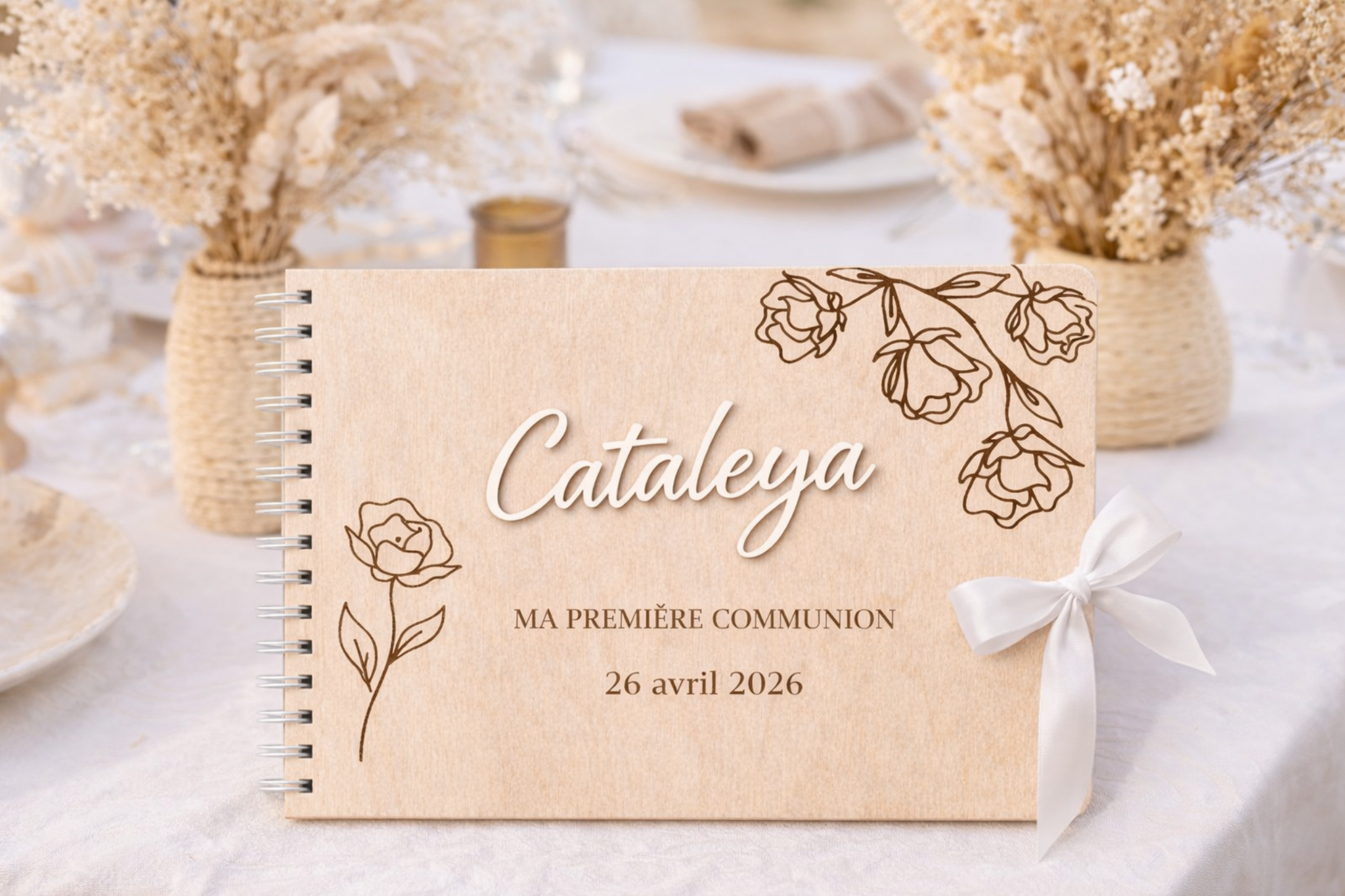 Le livre d’or en bois personnalisé comprend 40 pages blanches de haute qualité qui vous permettront de coller des photos et d’inscrire un petit message à côté. Un joli ruban de couleur de votre choix vient attacher votre livre d’or en bois.