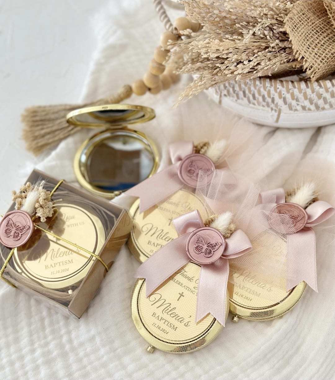 Chez Baby Sweetness, c’est simple ! Je vous propose ces jolis miroirs. Vous pouvez les personnaliser à votre goût afin de remercier vos invités de leur présence et leur prouver votre amour.