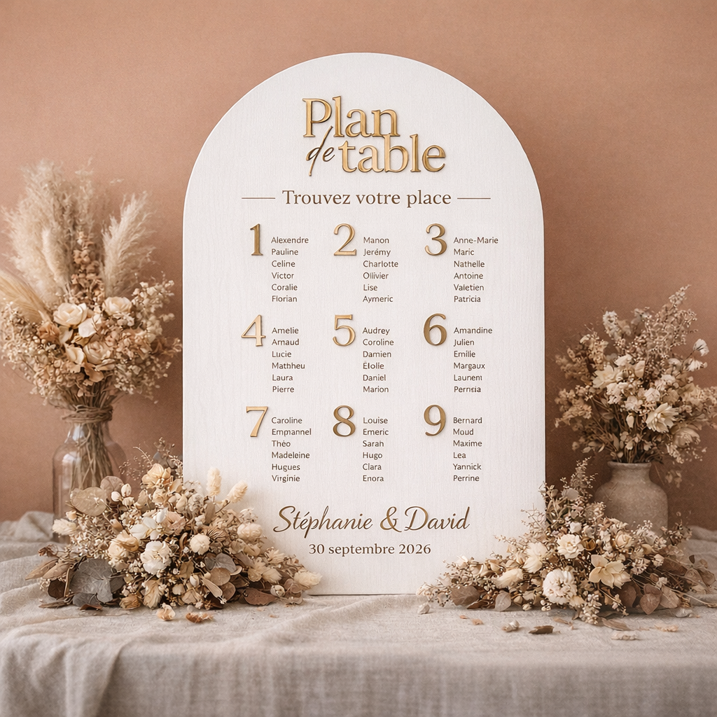 Personnalisé avec soin, ce plan de table s’adapte parfaitement à votre univers : romantique, moderne ou intemporel.
