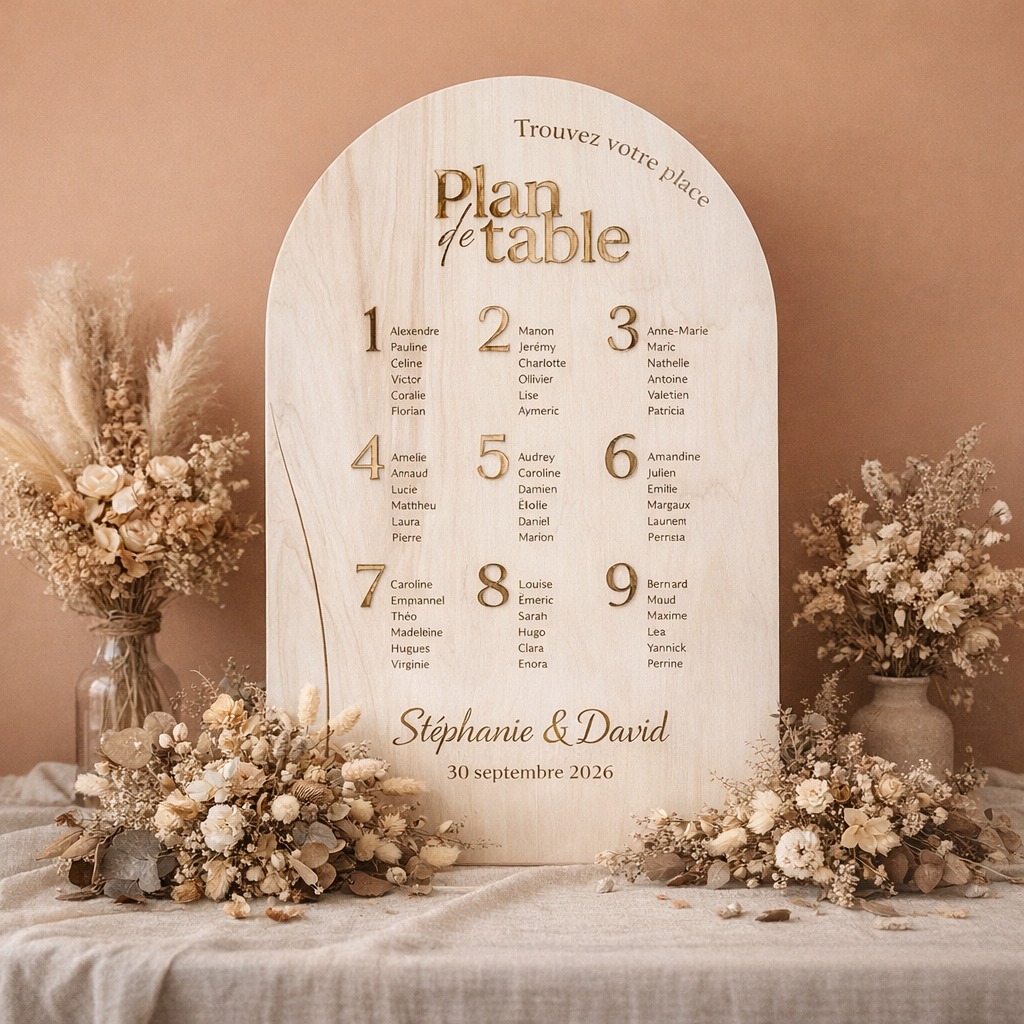 Personnalisé avec soin, ce plan de table s’adapte parfaitement à votre univers : romantique, moderne ou intemporel.