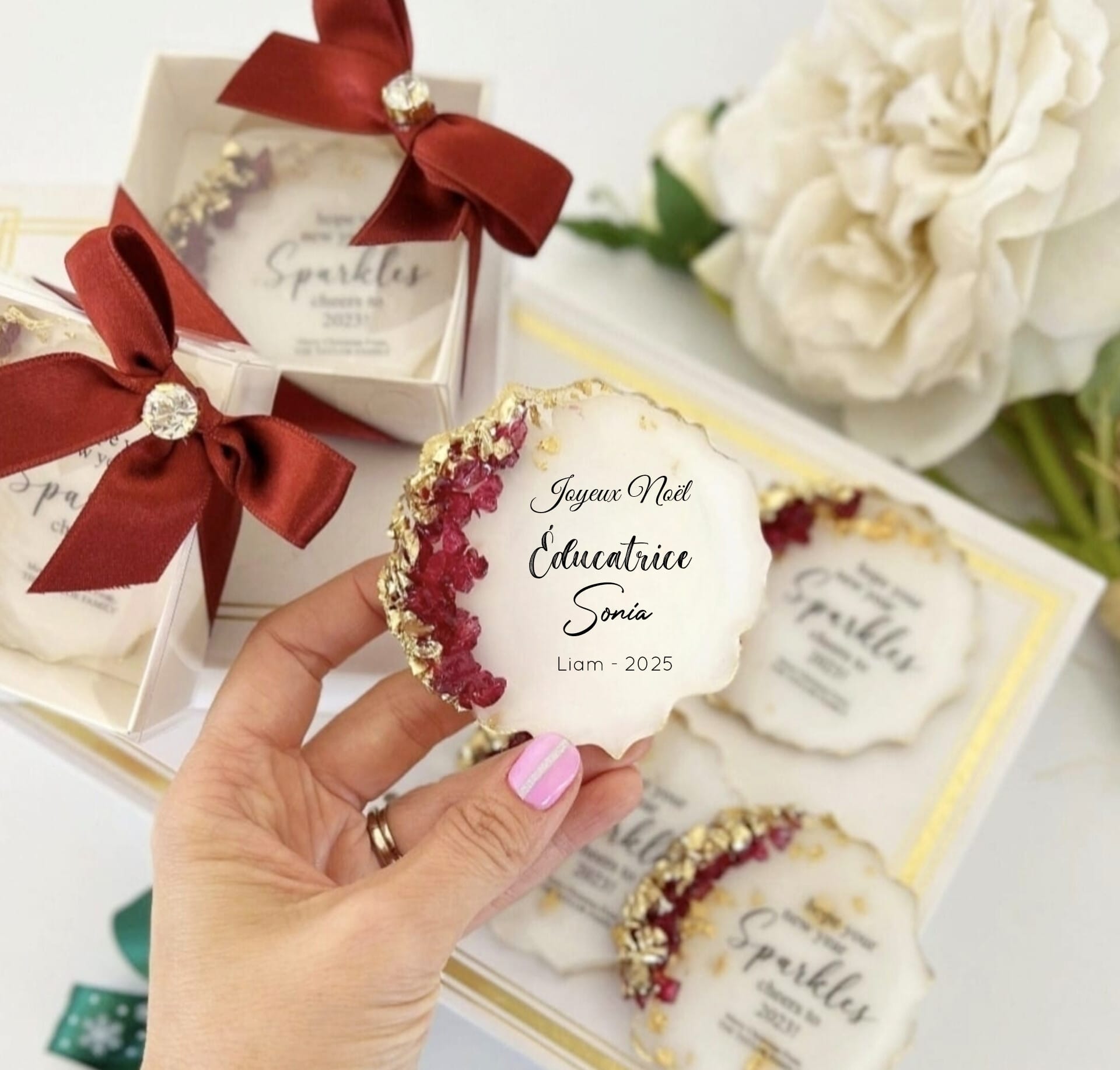 Offrez ces jolis magnets en résine à vos proches personnalisés avec un message de Noël de votre choix.