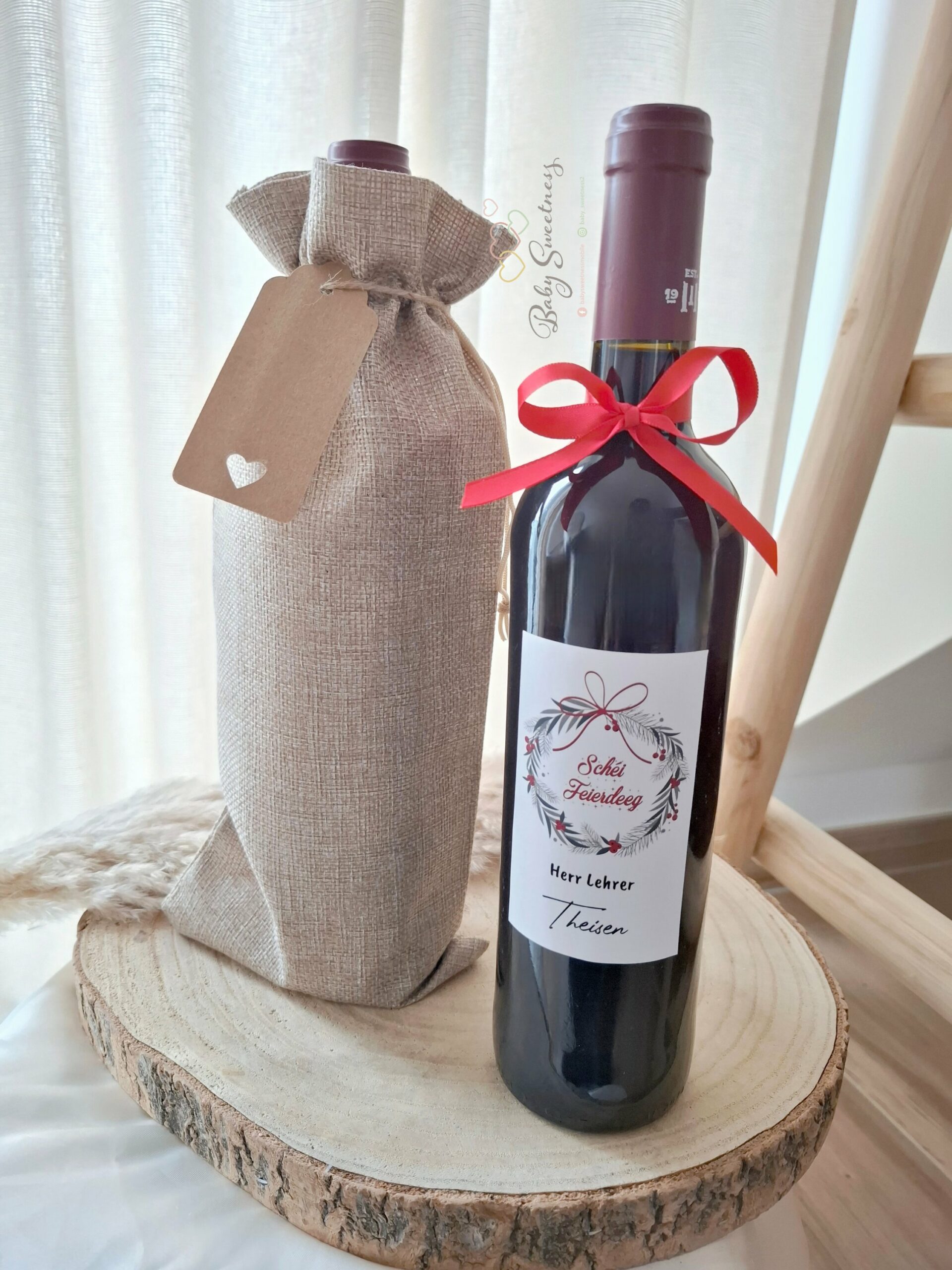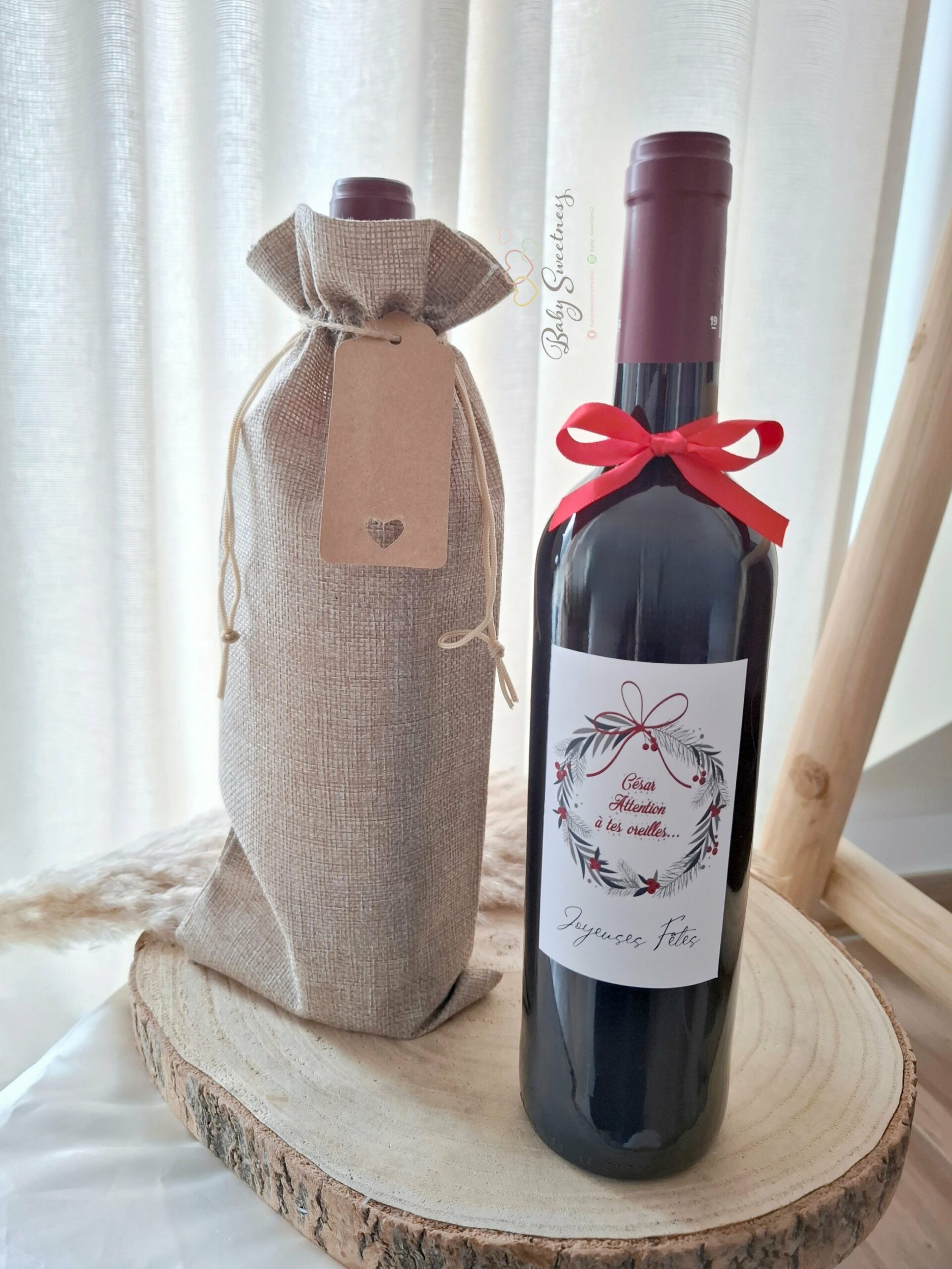 Baby Sweetness vous propose cette jolie bouteille de vin personnalisée dans son sac en toile de jute. Vous pouvez la personnaliser avec un nom ou petite phrase de votre choix.