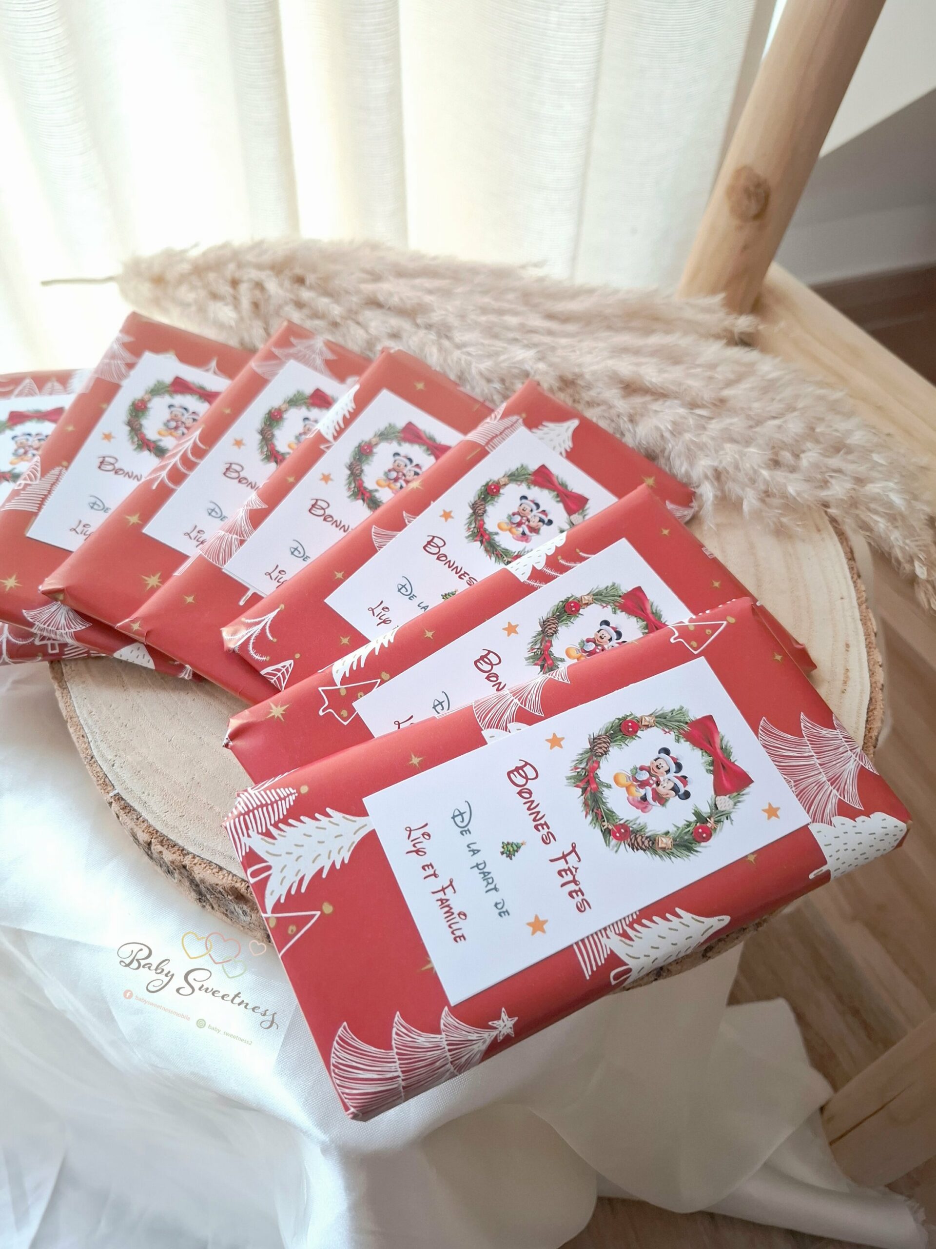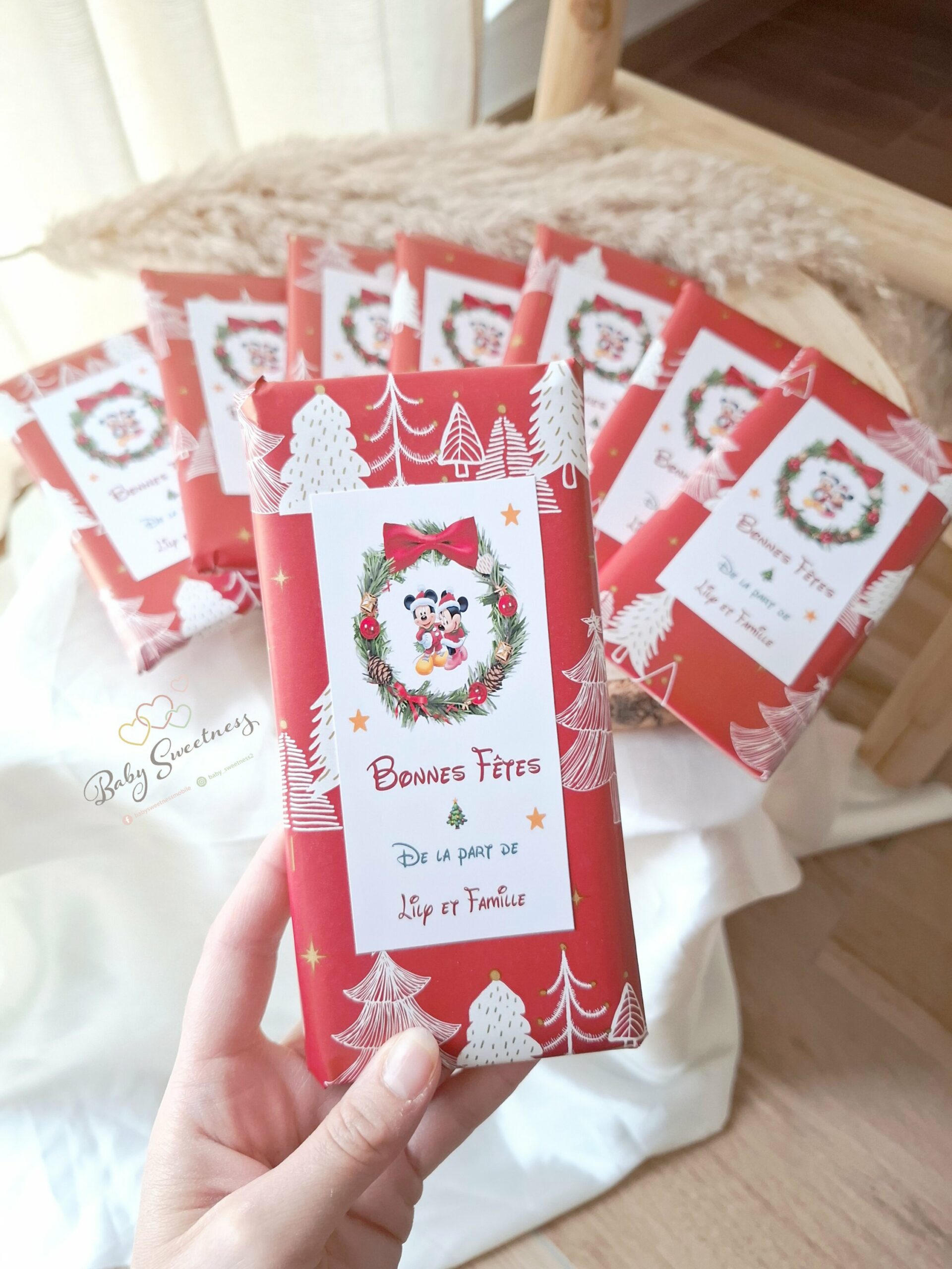 En achetant une tablette de chocolat personnalisée de la marque Baby Sweetness, vous avez la possibilité de choisir les couleurs, de les personnaliser avec une image et texte au choix. Vous pouvez les offrir aux maîtresses, nounous, éducateurs ou à un membre de votre famille. De plus, vous pouvez également l’associer à d’autres articles eux aussi entièrement personnalisables tels que les boules de Noël, chaussettes de Noël, etc.