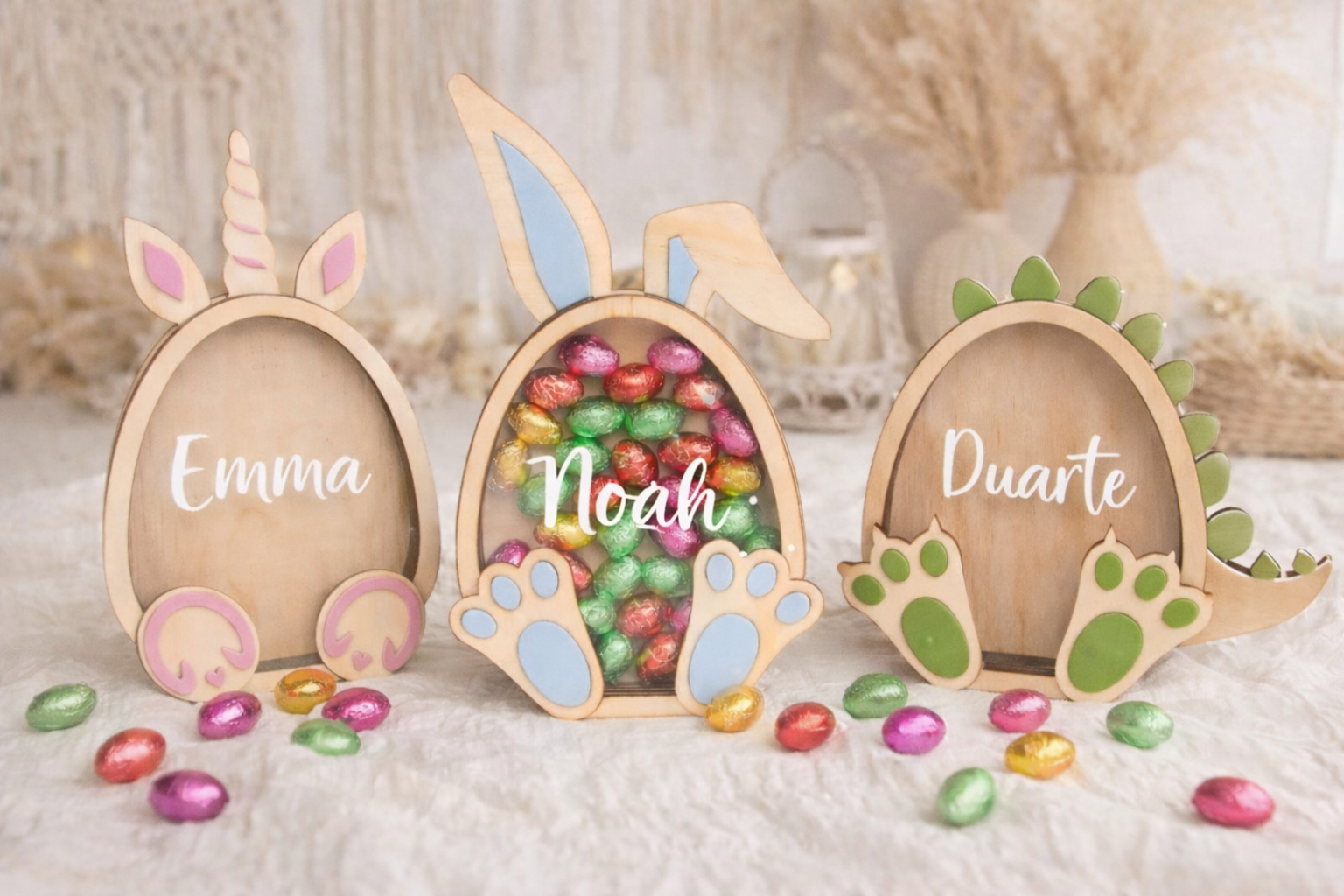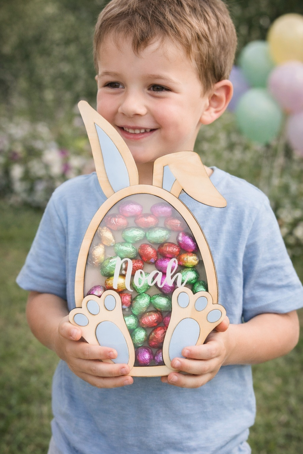 Gardez un superbe petit souvenir de la première chasse aux œufs de votre enfant avec cette adorable tirelire chasse aux oeufs entièrement personnalisé. Personnalisée par le prénom de votre enfant ou filleul, ce petit lapin de Pâques en bois pourra être disposé avec les œufs en chocolat, dans le jardin. Il pourra ainsi être réutilisé pour de nombreuses chasses aux œufs.